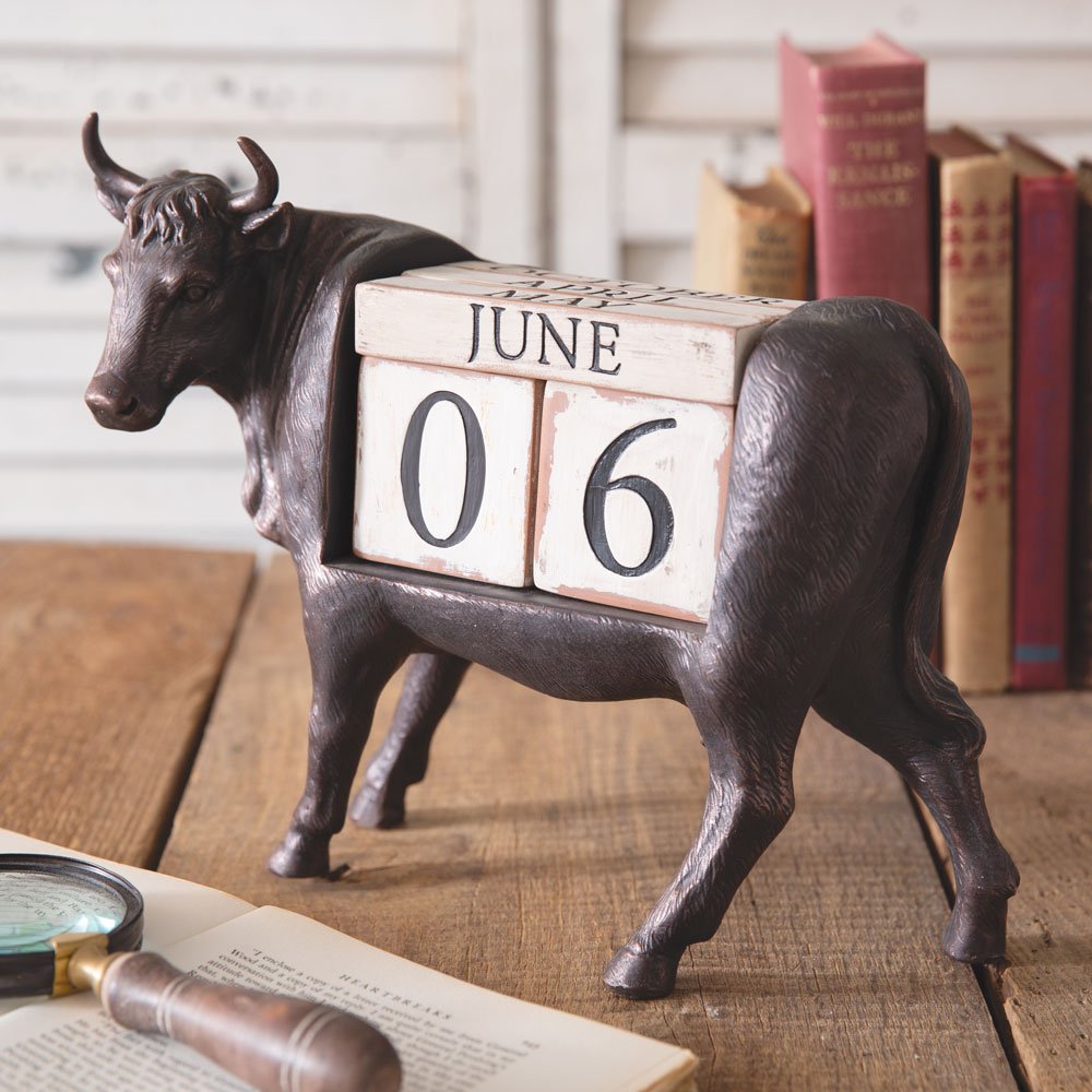 Our rustic cow will help you keep track of time with ease. It is the perfect gift for an office or anywhere in a home. The blocks allow you to change the months and dates daily. Item is crafted from resin with wood blocks.